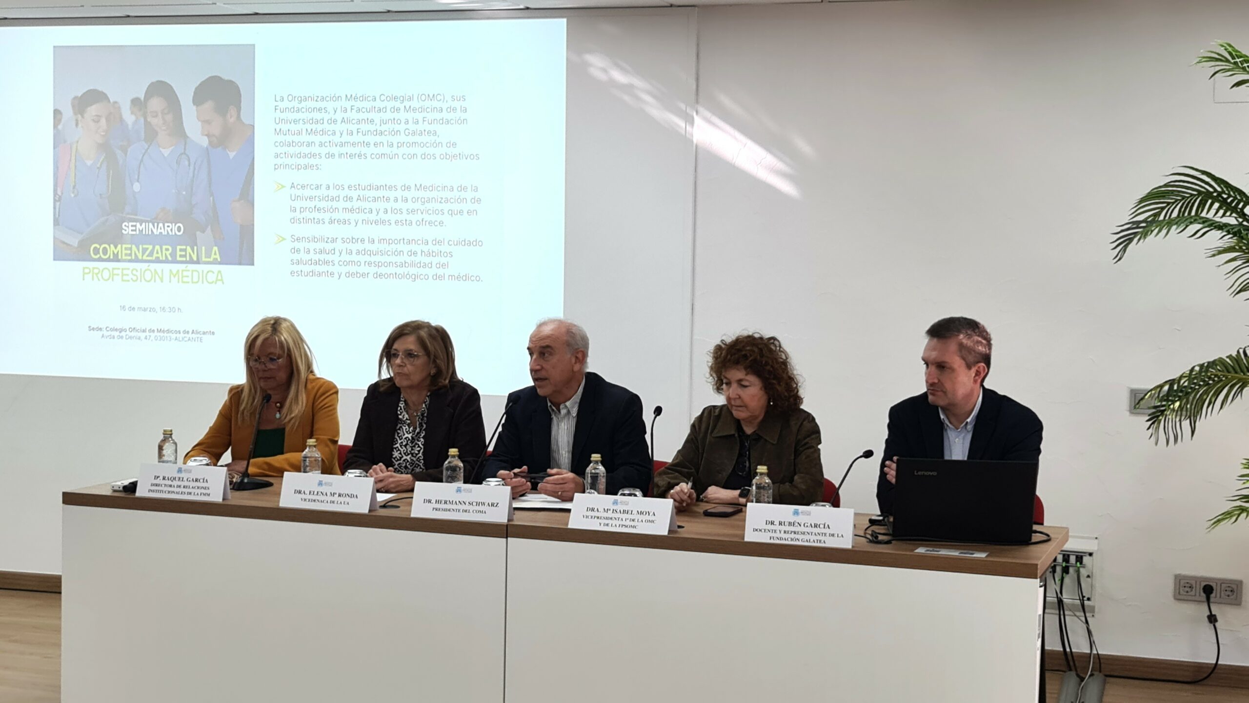 El Colegio Oficial de Médicos de Alicante (COMA) reunió el pasado lunes 16 de marzo a más de 80 estudiantes de 2º curso del Grado de Medicina de la Universidad de Alicante (UA) en el seminario ‘Comenzar en la Profesión Médica’. Aforo completo en una  sesión, concebida como un puente entre la Universidad y el ejercicio real de la Medicina, donde se ha combinado una guía práctica sobre representación profesional con un mensaje especialmente actual: el autocuidado no debe ser solo una opción, sino una responsabilidad ético-deontológica del médico y del estudiante de Medicina. Organizado junto a la Organización Médica Colegial (OMC), la Fundación para la Protección Social de la OMC (FPSOMC), la Fundación Mutual Médica y la Fundació Galatea, el seminario se ha dividido en dos bloques temáticos: “Organización y representación de la profesión médica: por qué y para qué” y “Salud y hábitos del estudiante de Medicina y del médico: el autocuidado como responsabilidad ético-deontológica”.