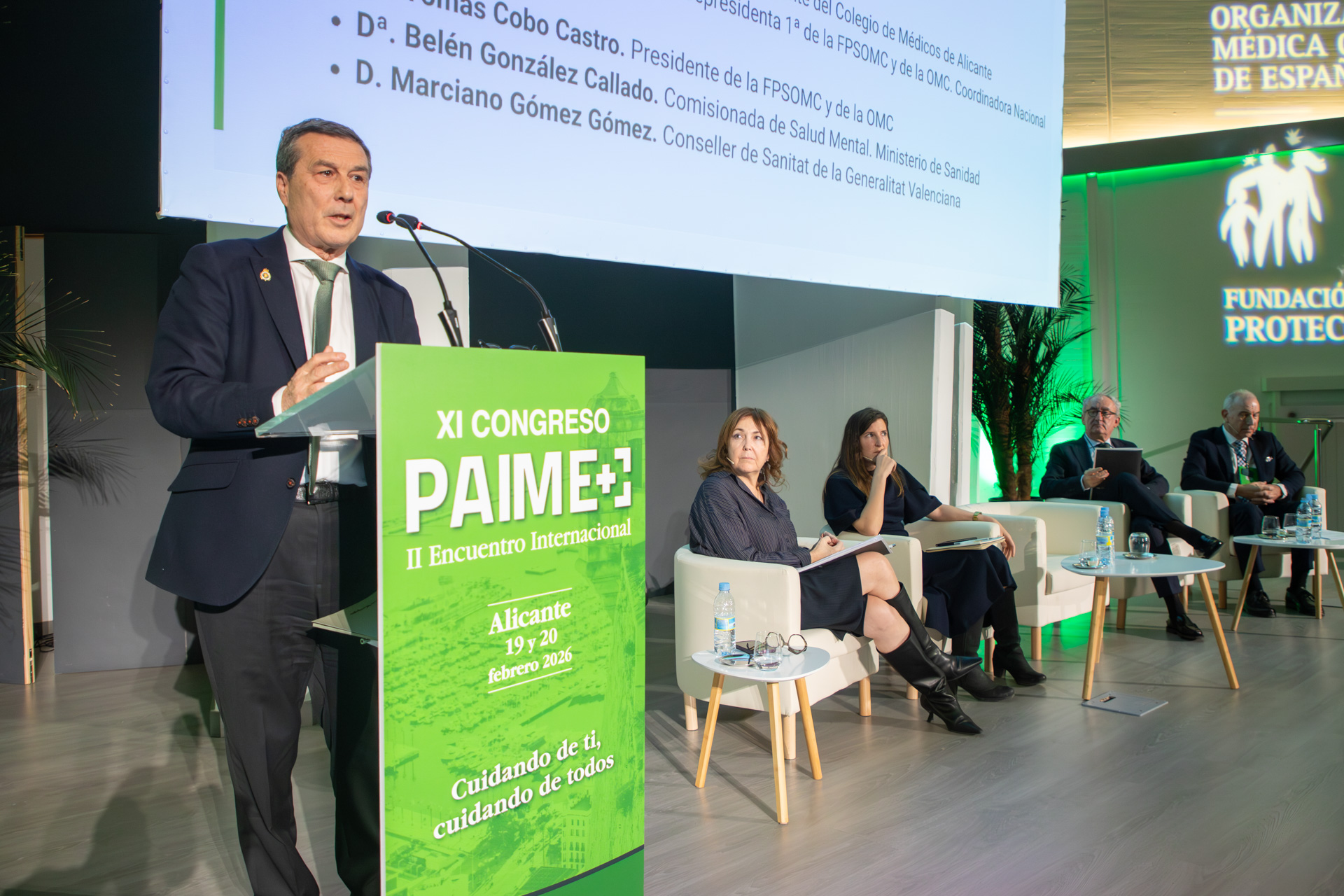 El acto inaugural ha contado con la participación de autoridades y responsables clave vinculados al ámbito sanitario y a la red colegial. Así, han intervenido el Dr. Hermann Fco. Schwarz Chávarri, presidente del Colegio de Médicos de Alicante; la Dra. Mª Isabel Moya García, vicepresidenta 1ª de la OMC, de la Fundación para la Protección Social de la OMC (FPSOMC) y coordinadora nacional del PAIME; y el Dr. Tomás Cobo Castro, presidente de la OMC y de la Fundación. Junto a ellos, han participado la Dra. Belén González , comisionada de Salud Mental del Ministerio de Sanidad, y el Dr. Marciano Gómez, conseller de Sanitat de la Generalitat Valenciana.