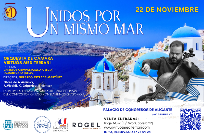El 22 de noviembre la ORQUESTA DE CÁMARA VIRTUÓS MEDITERRANI contará con la presencia del violoncellista griego Christos Grimpas quien interpretará dos obras de Antonio Vivaldi, la primera como único solista y la segunda junto a Romani Cana (primer cello de Virtuós Mediterrani).